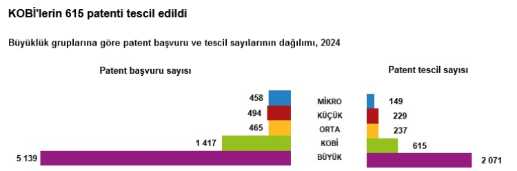 2024’te KOBİ’ler, toplam Ar-Ge harcamalarının yüzde 28,8’ini gerçekleştirirken, toplam Ar-Ge personelinin yüzde 43,7’sini istihdam etti. Aynı yıl KOBİ’ler 1.417 patent başvurusunda bulundu, 615 patent tescil edildi. Küçük ölçekli girişimler başvuru sayısında öne çıkarken, orta ölçekli girişimler tescil sayısında lider oldu.