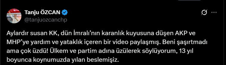 Aylardır susan KK, dün İmralı’nın karanlık kuyusuna düşen AKP ve MHP’ye yardım ve yataklık içeren bir video paylaşmış. Beni şaşırtmadı ama çok üzdü! Ülkem ve partim adına üzülerek söylüyorum, 13 yıl boyunca koynumuzda yılan beslemişiz. pic.twitter.com/sfab2fzsKY